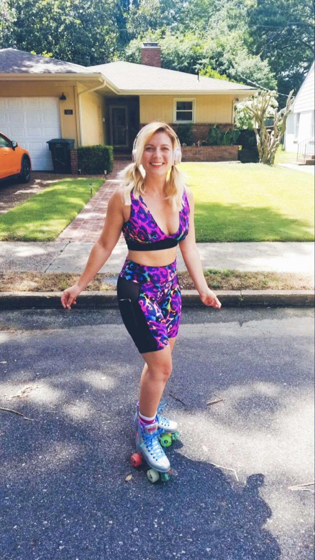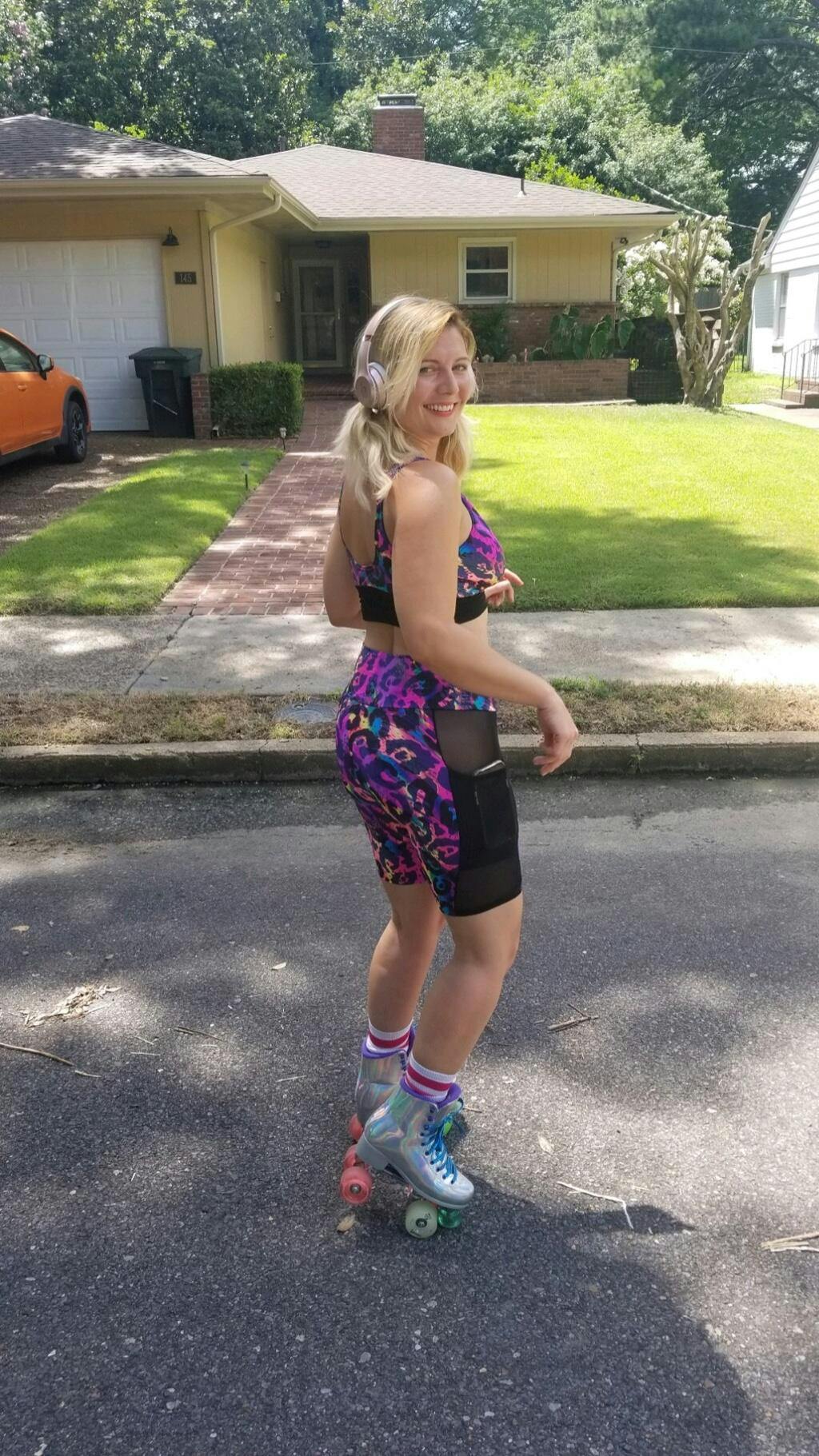 Bike shorts have a high waistband, and an 8" inseam, which makes them super comfy and easy to wear! No tugging them up or pulling them down, they just stay right where you want them, giving you complete freedom of movement.