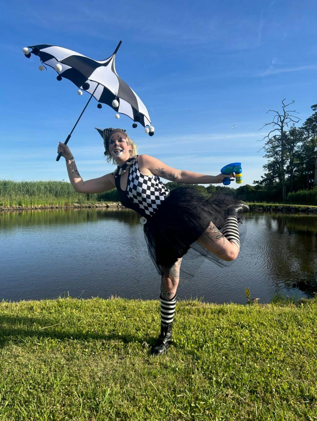 This bodysuit is split fabrics, black mystique on the wearer's right and black & white diamond print on the wearer's left with a black mystique v neck in front.